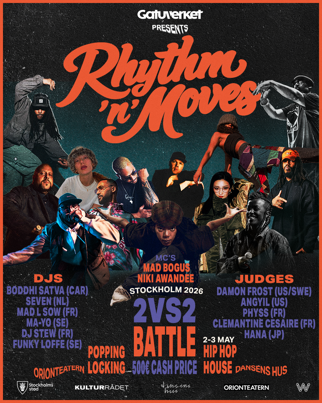 Rhythm n’ Moves Battle - will take place over two days and two stages. Starting at Dansens Hus on May 2nd with tryouts (free entrance) while the quarter-finals, semi-finals and finals will be held at Orionteatern on May 3rd.